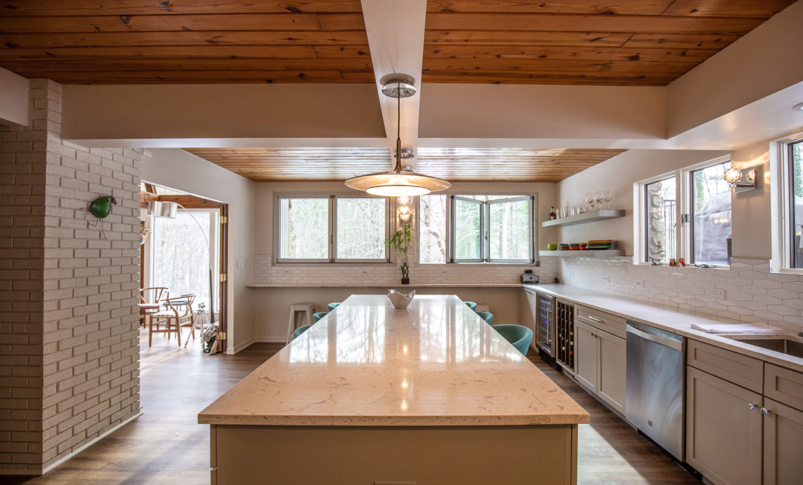 A modern passive home gets a new kitchen makeover and updates throughout. A NanaWall system provides light and air to new enlarged, yet simplified kitchen layout.